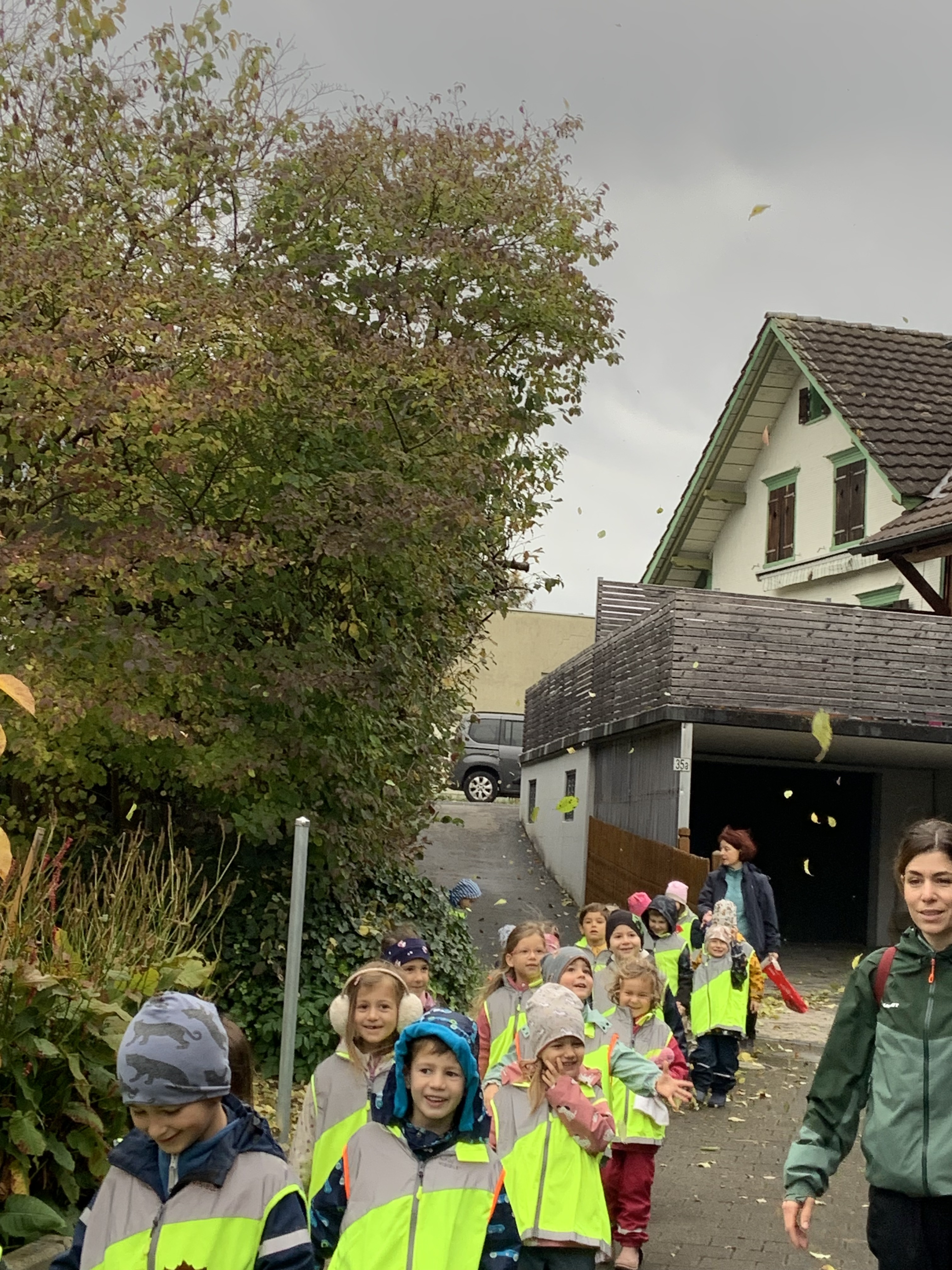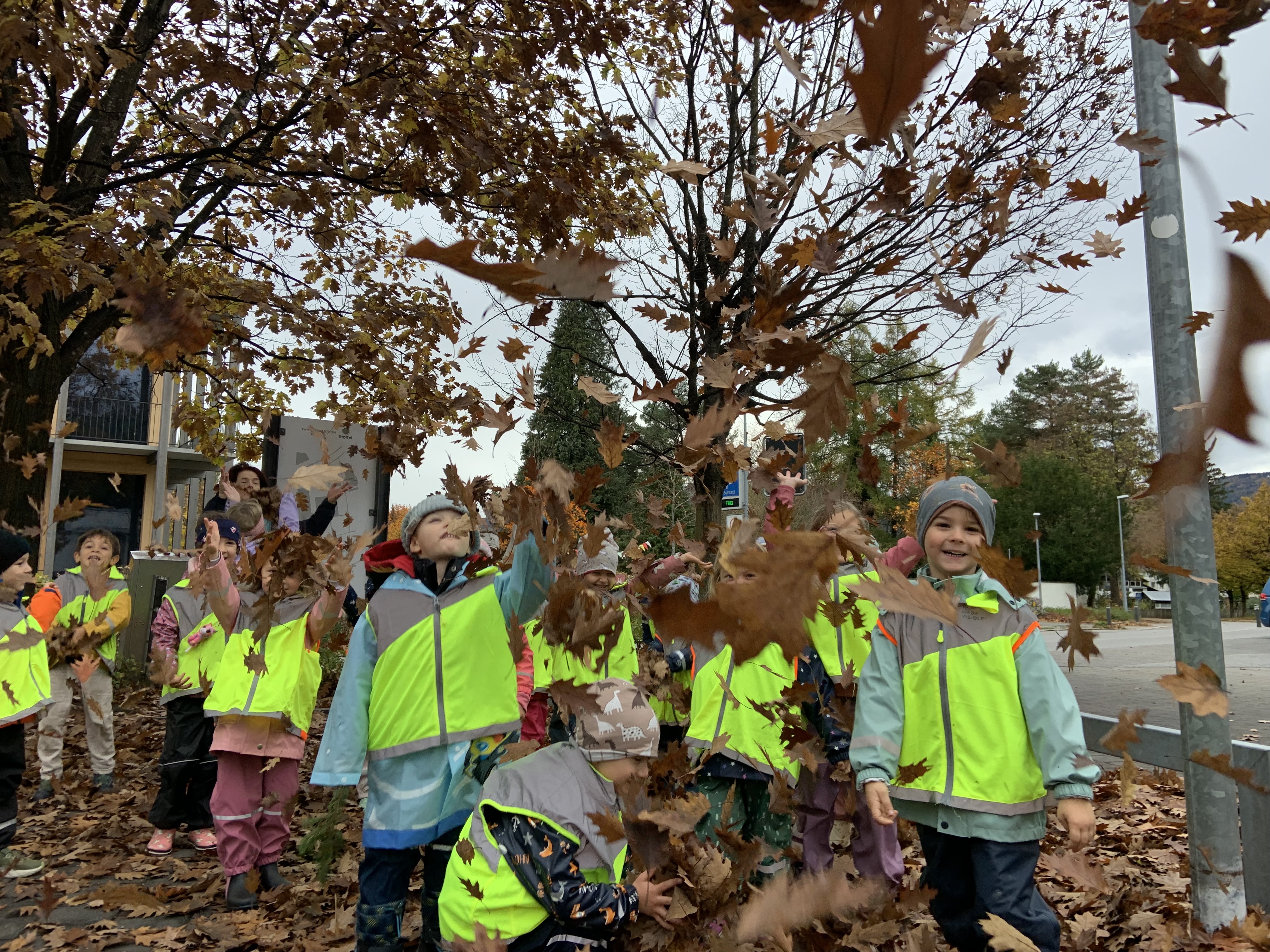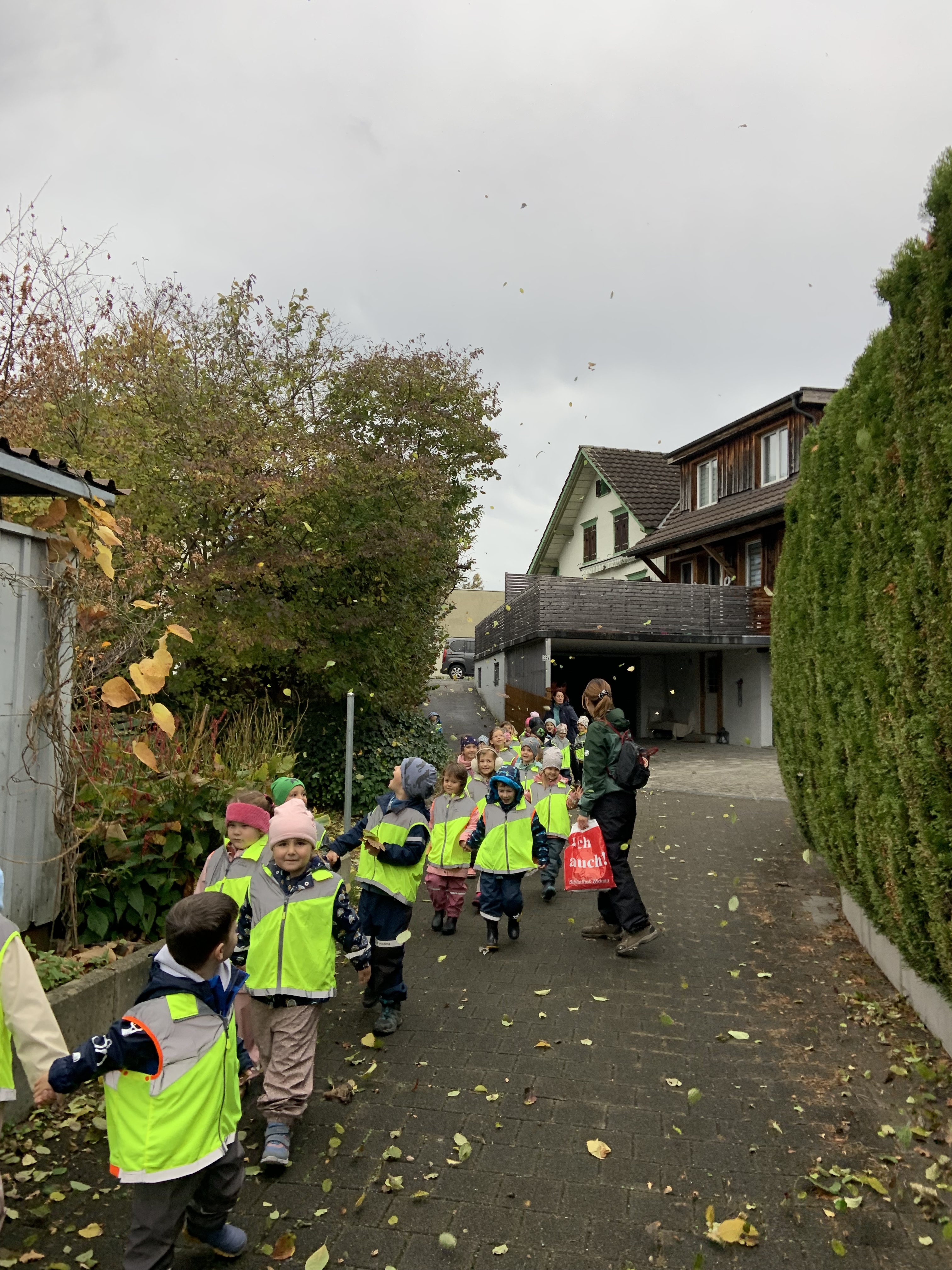Zuerst kam die schlechte Nachricht - Sturm an unserem geplanten Waldmorgen. So schnell liessen wir uns aber nicht unterkriegen und planten einen Herbstmorgen bei uns rund um den Kindergarten Schlatt. Das Wetter meinte es dann doch noch gut mit uns und wir durften einen Spaziergang mit Wind erleben. Wir wurden von vielen Blättern umwirbelt, durften fasziniert den Vögeln in der Luft zuschauen und haben jede Menge wunderschöne Herbstblätter gesammelt. Es war ein Spaziergang zum Staunen, Entdecken und Erleben.