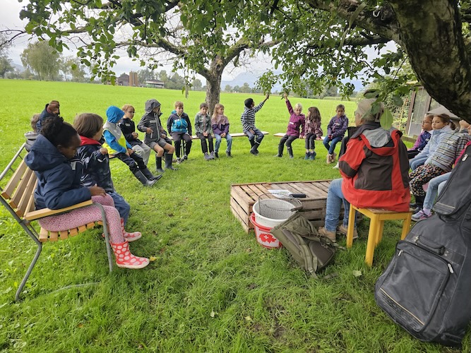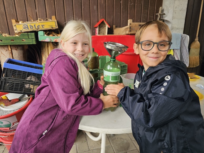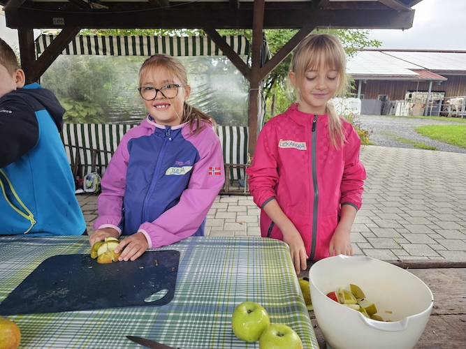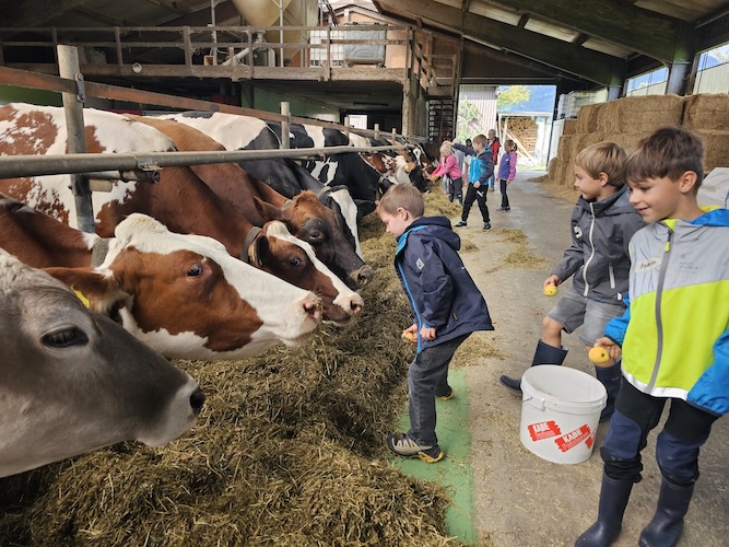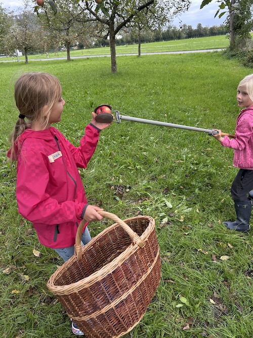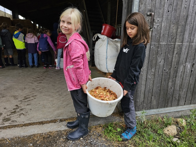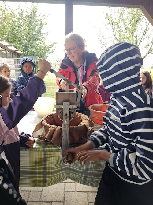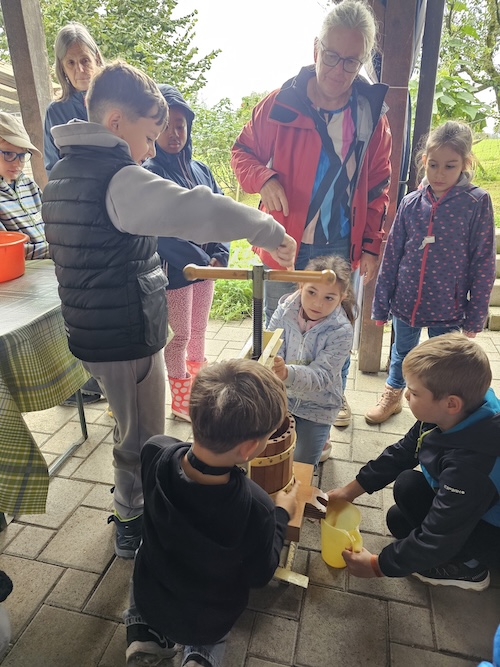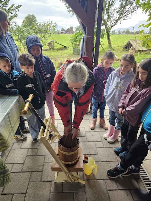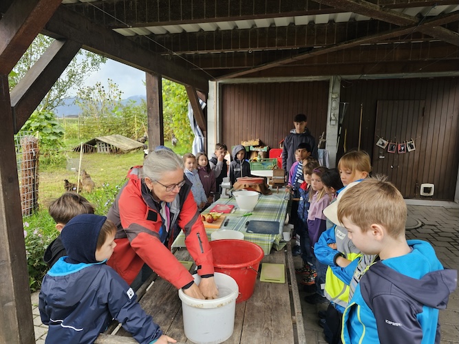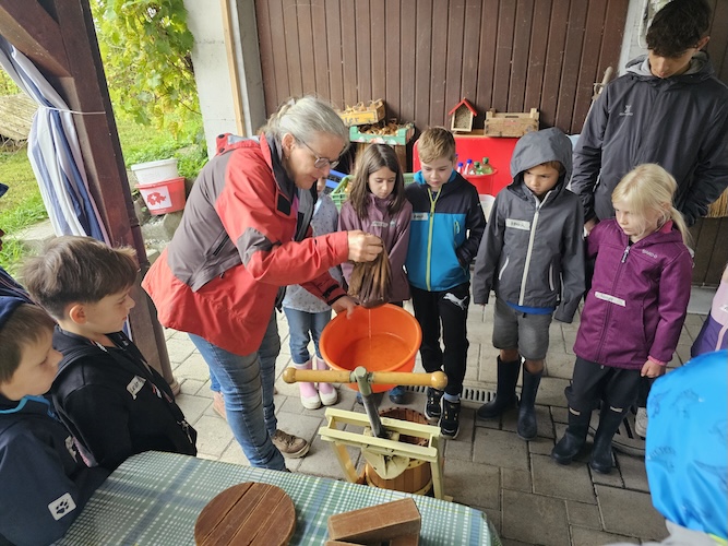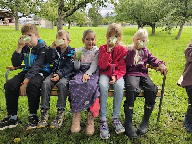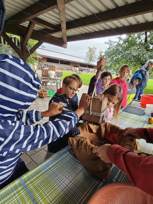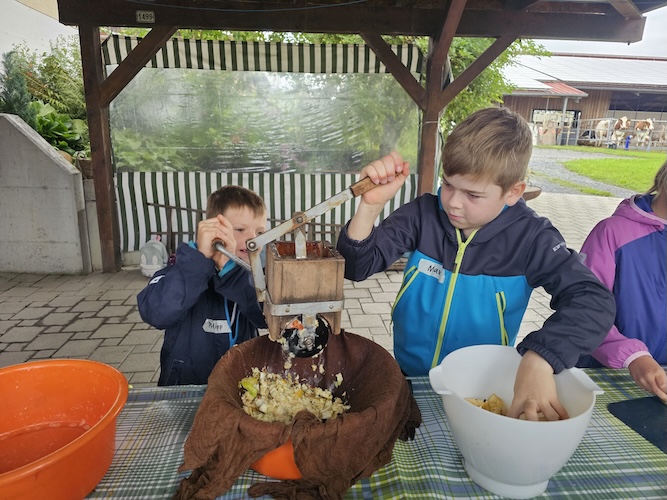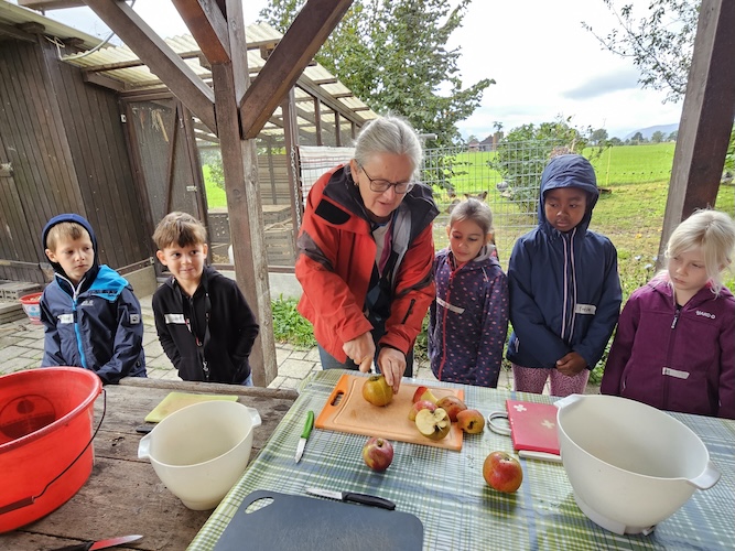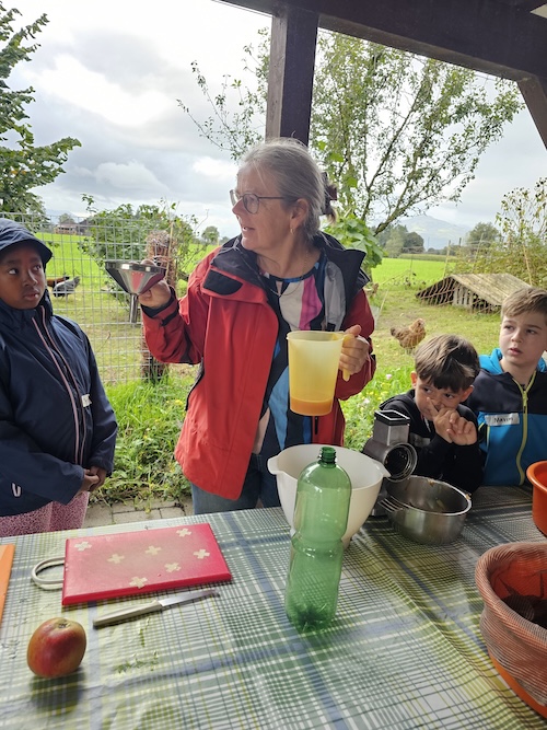 Viele 1. und auch 2. Klassen von Widnau nutzten die Gelegenheit und besuchten den Wiesenhof in Balgach. Dort konnten sie unter der Anleitung von Frau Ritz selbst Schritt für Schritt den beliebten Apfelsaft zubereiten.