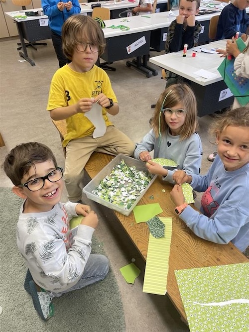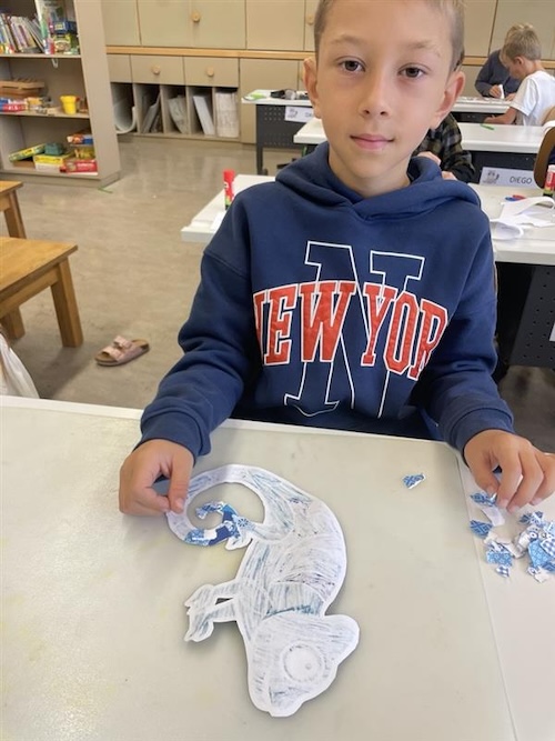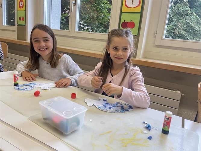 Danach durften alle sein eigenes Chamäleon angepasst an die Umgebung basteln. Nach den Herbstferien sind diese getarnten Tiere ums Rüti zu finden. Wer entdeckt am meisten der kleinen Tierchen?