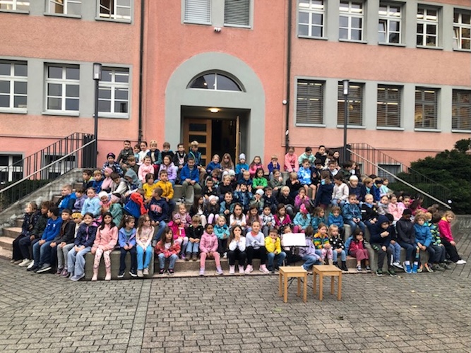 Rütitreff! Dieses Mal hörten alle SchülerInnen die Geschichte «Seine eigene Farbe, Leon Lionni» Der Rütichor sang «mini Farb und dini».